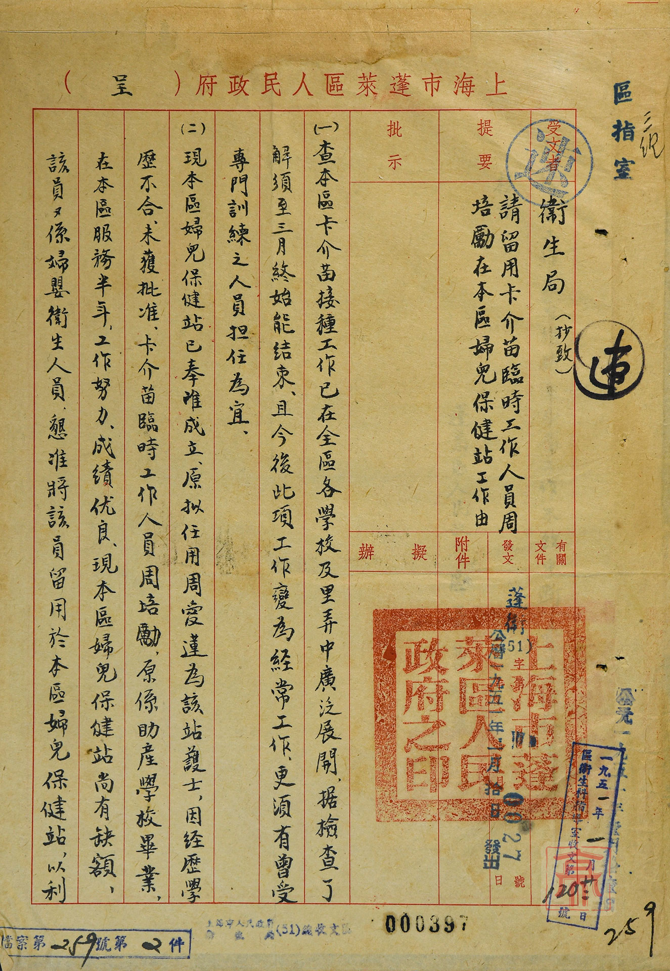 请留用卡介苗临时工作人员周培励在上海市蓬莱区妇儿保健站工作的信件